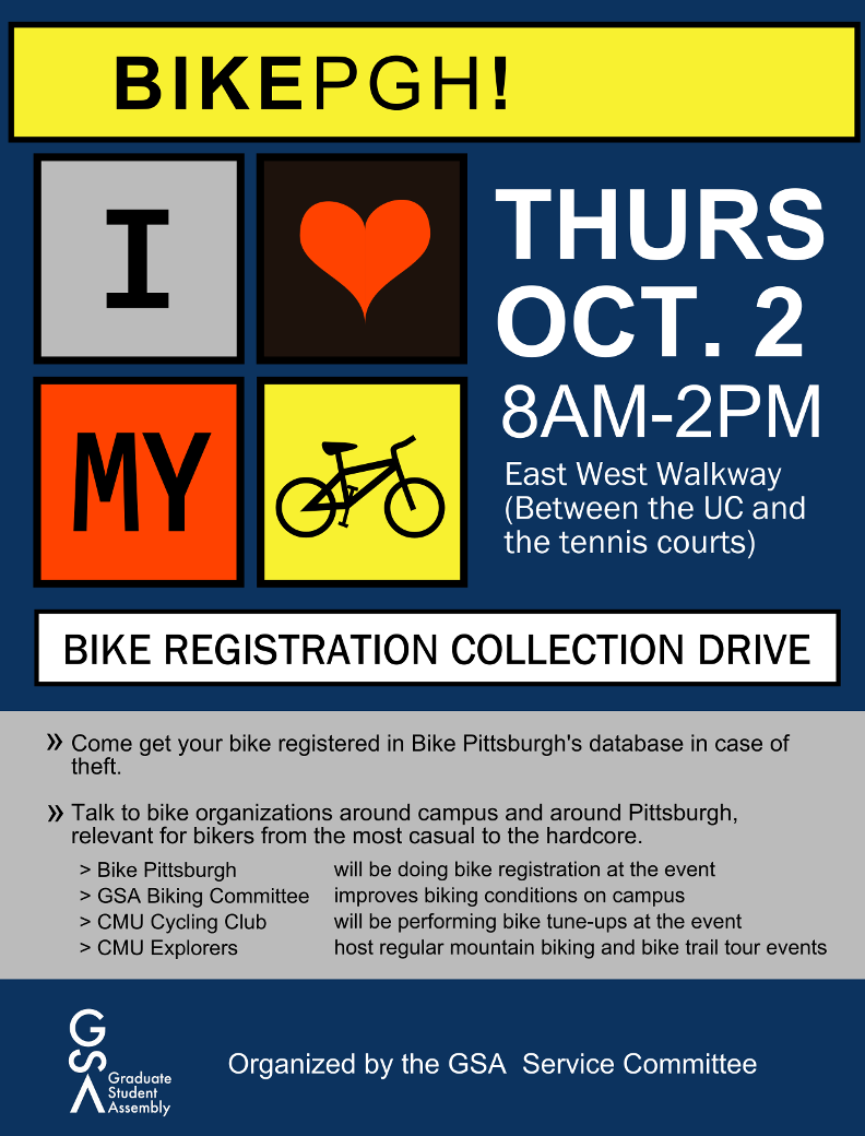 Our graduate student organization (the GSA) used to have a service committee. This "I <3 My Bike" event was for bike-related non-profits to encourage people to register their bike and encourage people who wanted to start biking. I designed this poster in the style of